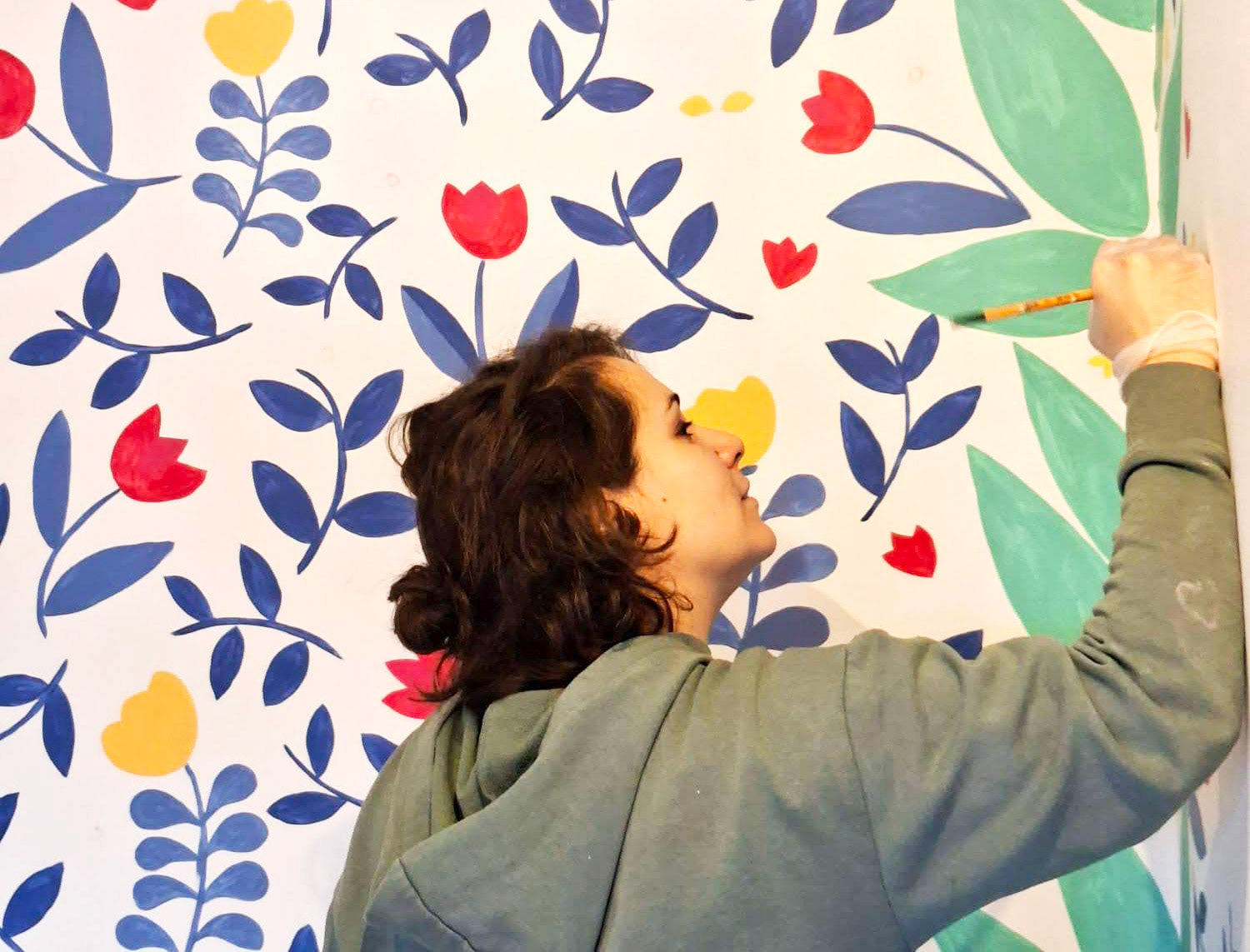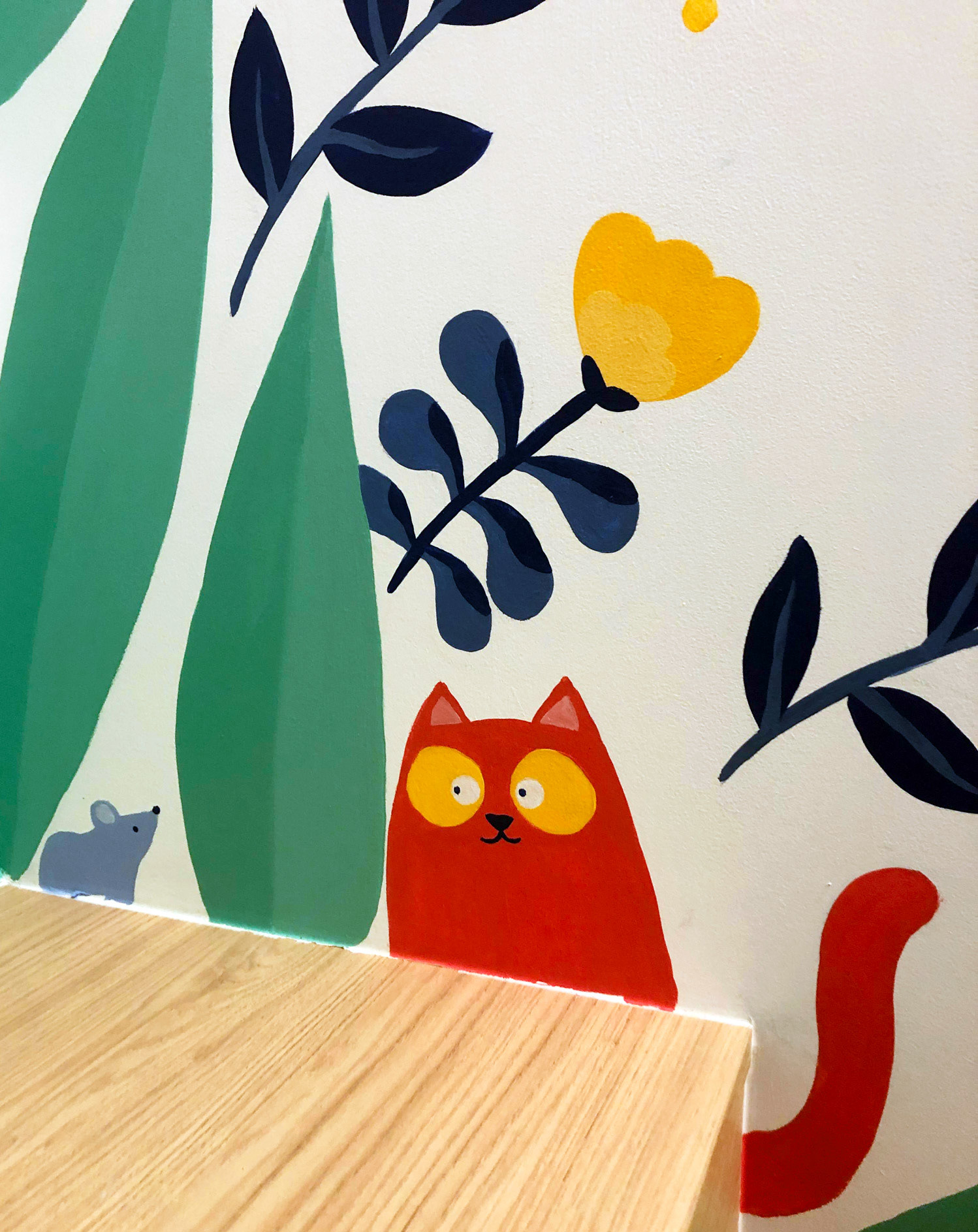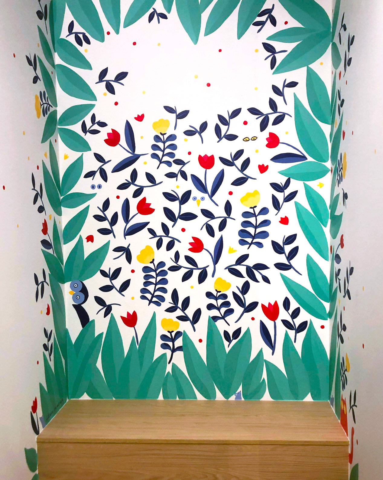 Réalisation d'une peinture murale dans une alcôve pour la librairie Les feuilles bleues (Paris)